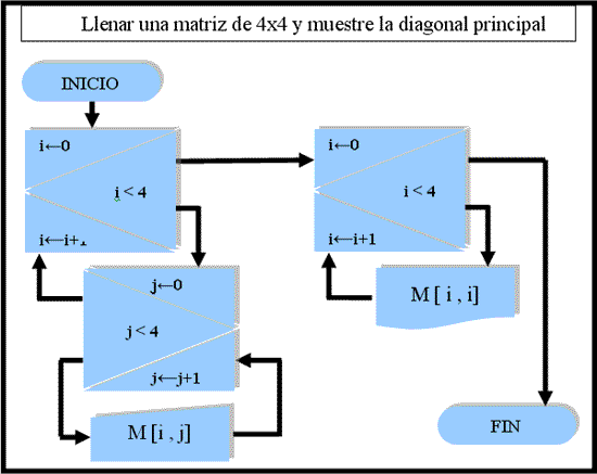 DIAGRAMACIÓNEjercicio No. 10 Diseñar un diagrama de flujo que pida los datos para llenar una matriz de 4x4 y después muestre los elementos de la diagonal principal. Este ejercicio consta de dos partes que son: Primera parte: LLenar la matriz. Como nos indican que va a ser de 4 por 4, no es necesario solicitar el numero de celdas (fila y columna) asà que pasamos a pedir directamente los dieciseis datos y los ponemos en la matriz. Para esto utilizamos dos ciclos automáticos encontrados. Segunda parte: Posteriormente mostramos los valores de la diagonal principal y para ello no es necesario más que un solo ciclo y mostramos el elemento que tanto el renglon (row) como la columna (column) tienen el mismo Ãndice (i,i).
