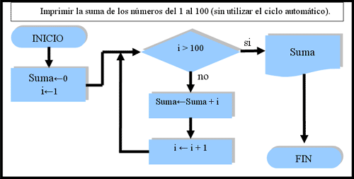 Diseñar un diagrama de flujo para calcular e imprimir la suma de los números del 1 al 100, utilizando el simbolo de desición. RESPUESTA: